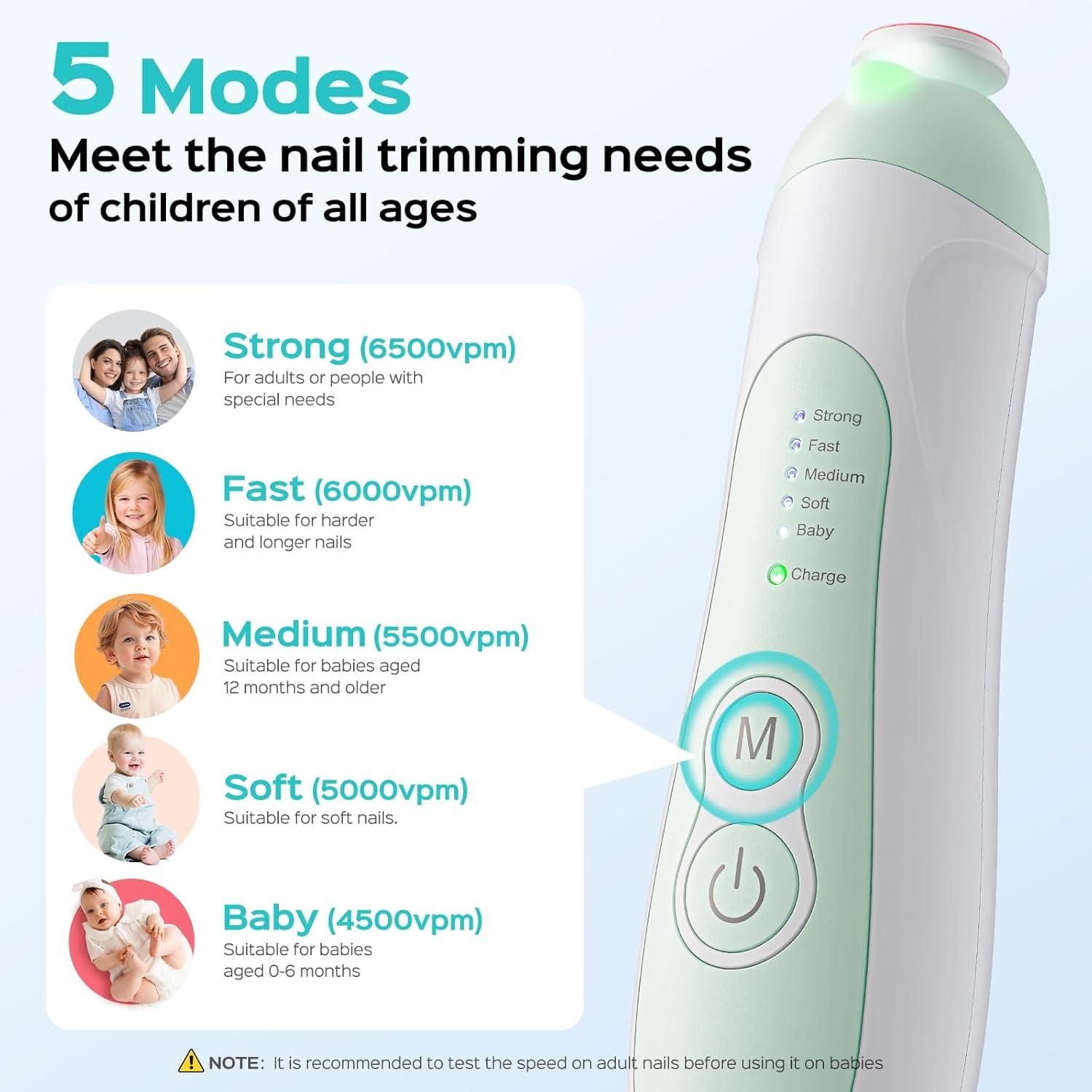 5 Speed Modes for Every Age Needs: Experience tailored nail care. The baby nail filer offers 5 specialized speeds to gently and efficiently file kids' nails, from delicate newborns to resilient pre-teens. This customizable control, combined with multiple attachments for different ages, ensures a quick, safe care for every toddler. No fear of traditional clippers.