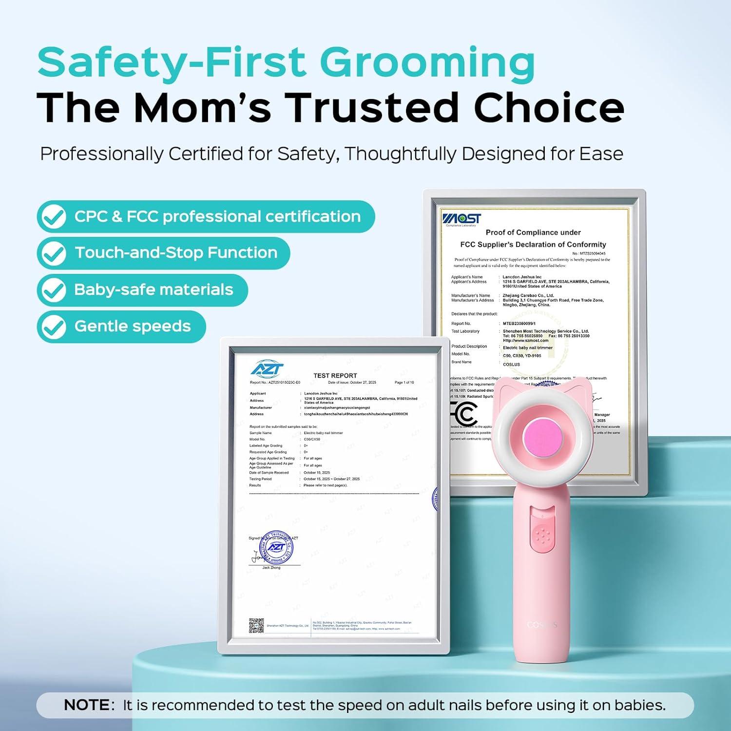 Ultimate Peace of Mind, CPC Certified Safe & Gentle: Rest easy with the CPC-certified baby nail file designed for total safety, Prioritize your baby's comfort.Its skin-sensing technology automatically stops to avoid nicks. Crafted with baby-safe materials and an ergonomic grip for maximum control, even new parents can provide a safe and gentle care for your infants, minimize the risk of scratches effortlessly.